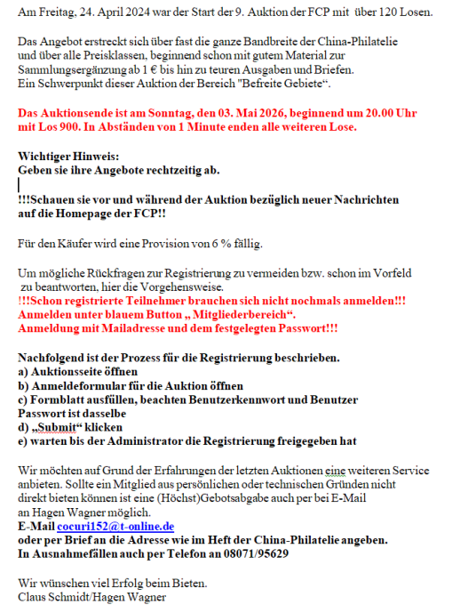 In der China-Philatelie 193 ist ein Artikel enthalten mit einigen ausgewählten, attraktiven Losen und den Details zur Auktion.