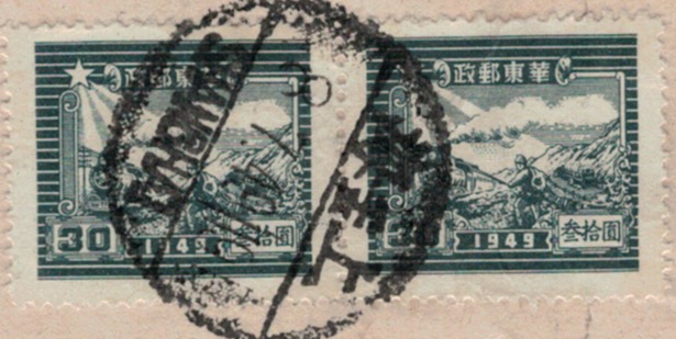 China, Ganzsache Ostchina, Bürgerkriegsausgabe 1949, 17,5×8,5 cm, 2x Mi. 50, kleine Zeichnung auf der Vorderseite