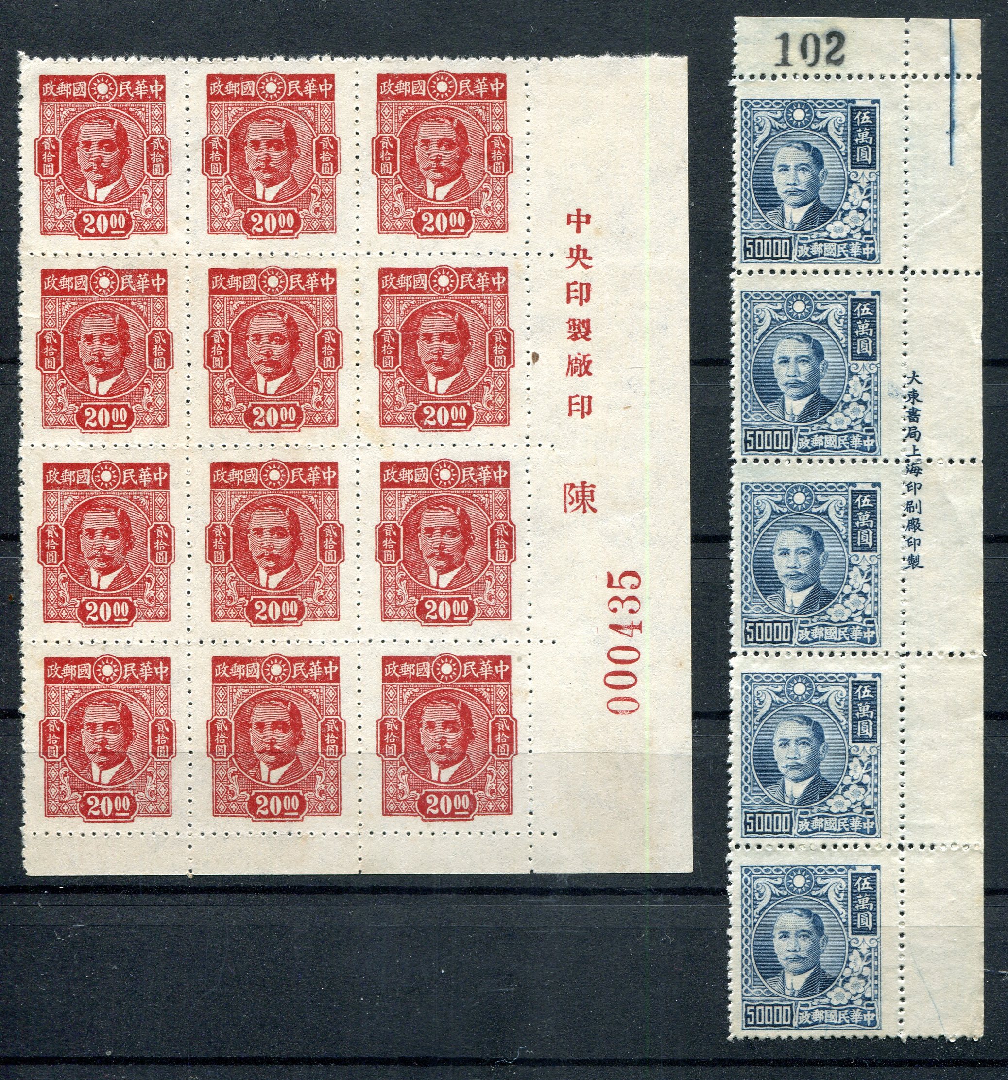 Republik China, 1942, Mi. 456, 667, 808, *, Eckrandstücke mit Druckereizeichen