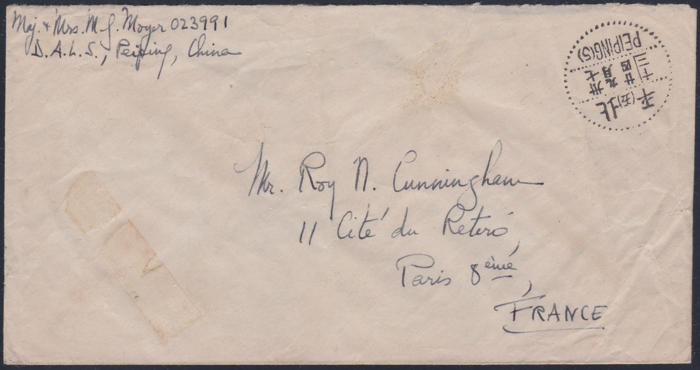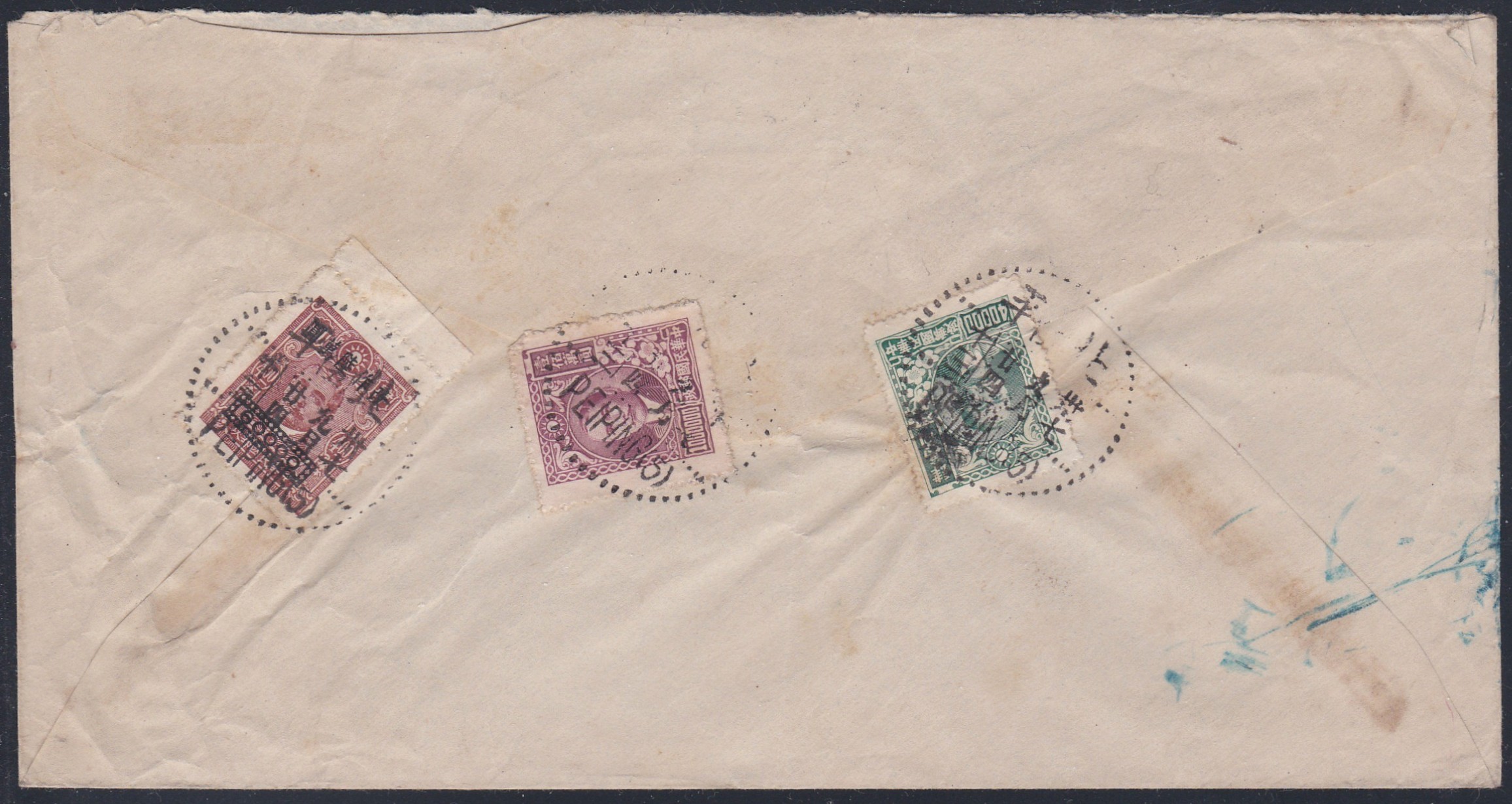 Luftpostbrief aus Peking, frankiert mit Michel Nr. 807, 813 und 873. Deutlich lesbarer Stempel Peiping (5). Verwendung in den letzten Tage der Inflation. Michel-Nr. 873 wurde am 28.9.1948 ausgegeben und am 7.10.1948 gab es die Gold-Währung. Verwendungszeit daher nur 9 Tage.