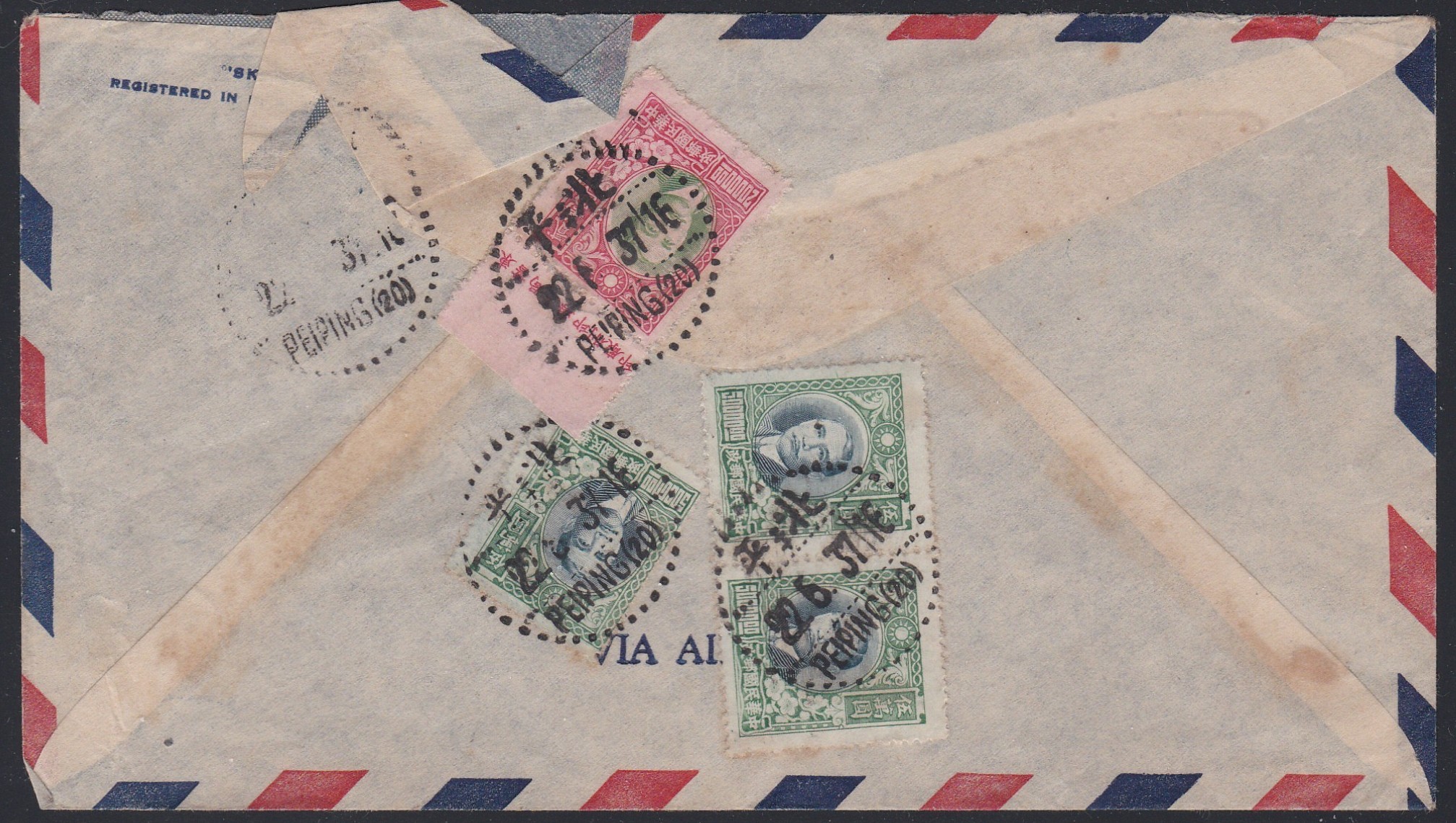 Luftpostbrief aus Peking, frankiert mit Michel Nr. 799 und 800 (3x). Deutlich lesbarerer Stempel Peiping (20) am 22.5.37, also vom 22.5.1949.