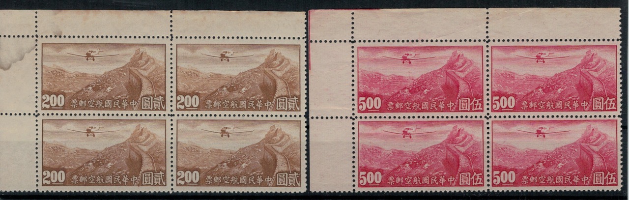 Republik China, 1940/41, Mi. 369-379, Flug über Chinesische Mauer, ohne Wasserzeichen. kpl. Satz Viererblöcke ohne Falz,