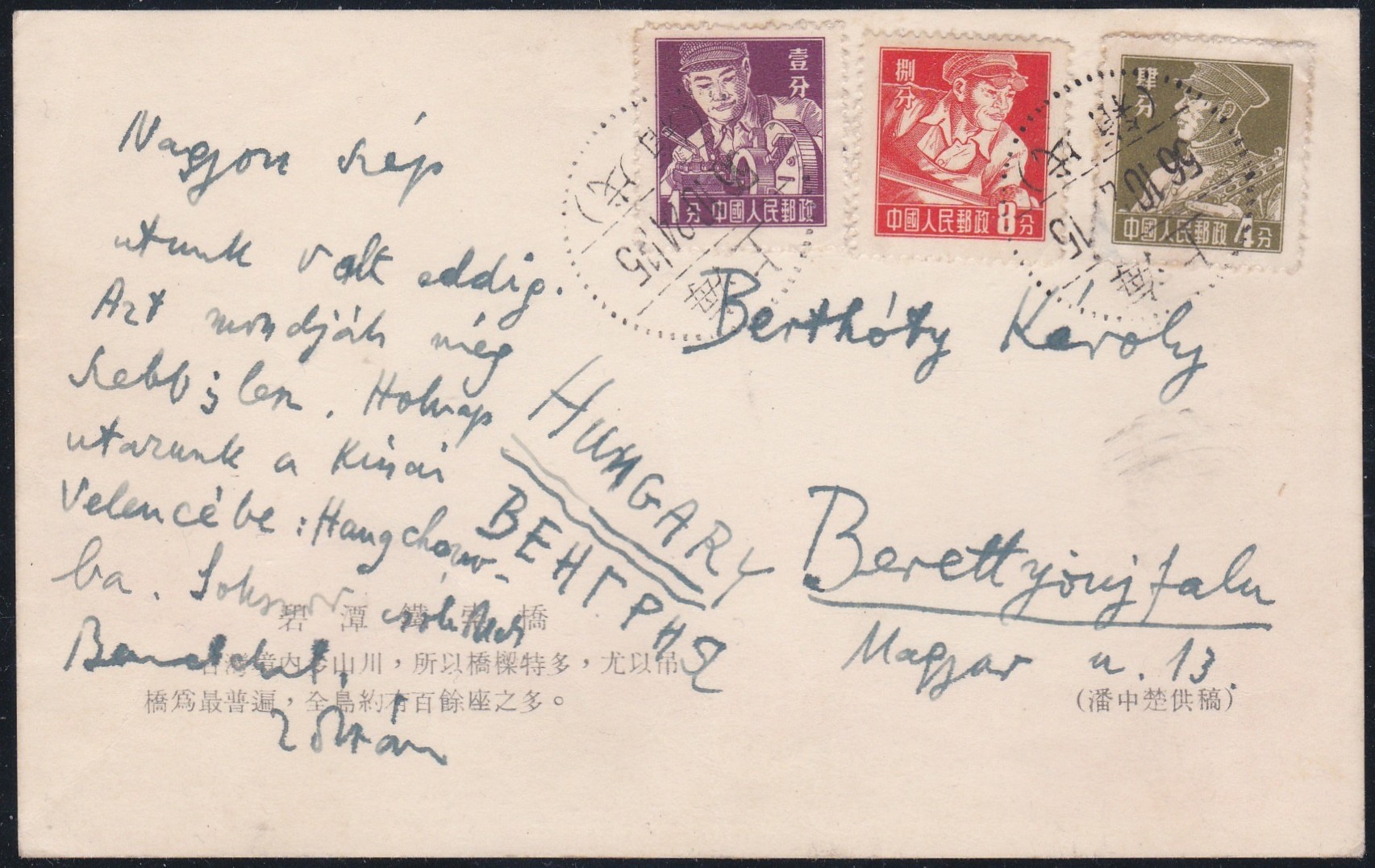 Postkarte (Hängebrücke) frankiert mit drei Briefmarken aus der Serie „Werktätige“ (Michel Nr. 298, 301 und 302) zu insgesamt 13 Fen. Verwendet am 24.10.1956 und gesendet nach Ungarn.