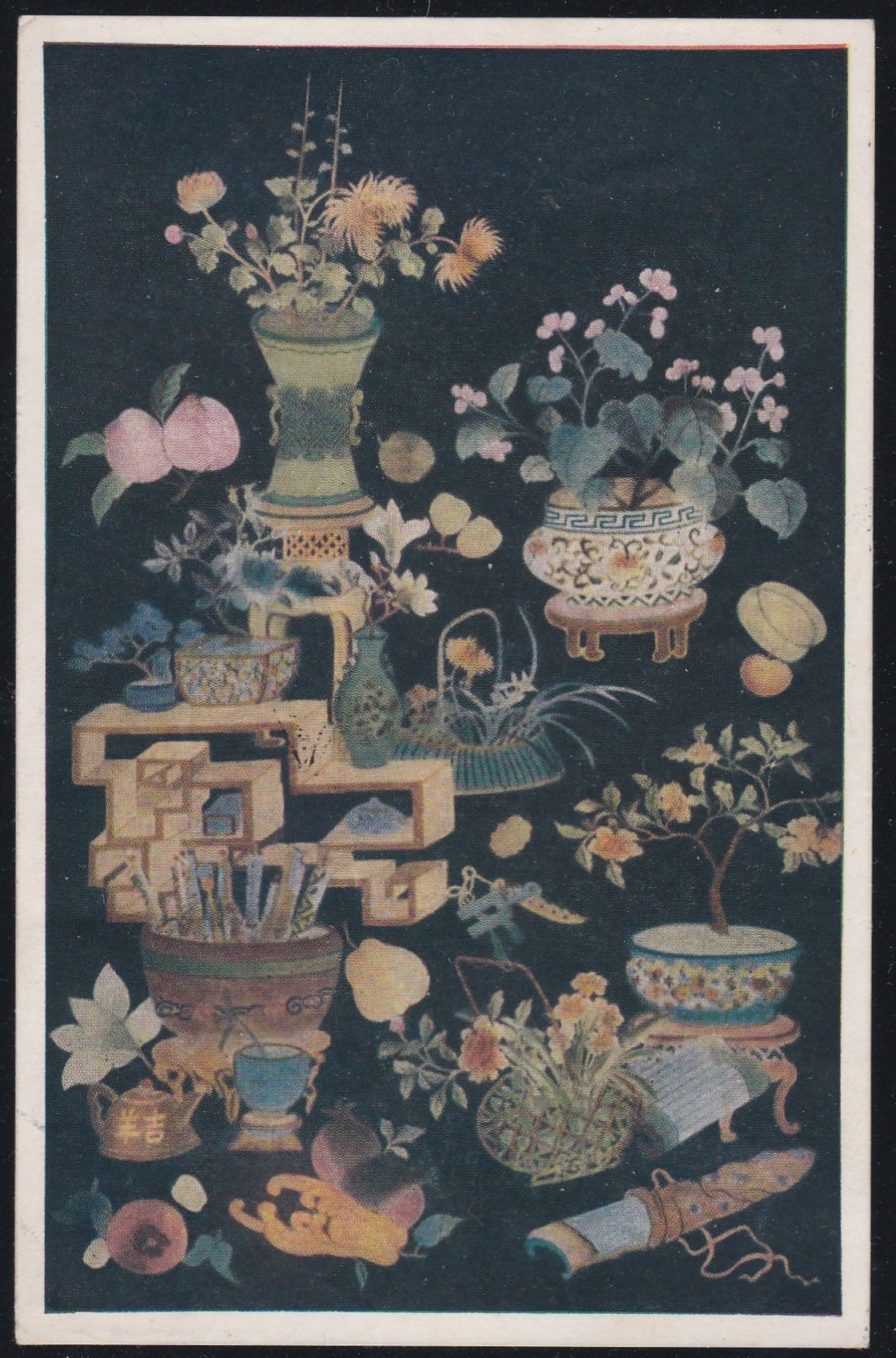 Postkarte (Blumenstilleben) frankiert mit drei Briefmarken aus der Serie „Werktätige“ (Michel Nr. 298, 301 und 302) zu insgesamt 13 Fen. Verwendet am 27.2.1956 und gesendet nach Budapest/Ungarn.